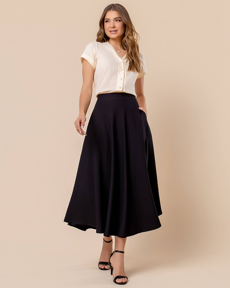 Zíper invisível na lateral, bolsos invisíveis, comprimento longuete e uma modelagem godê tradiconal, com muito movimento.
