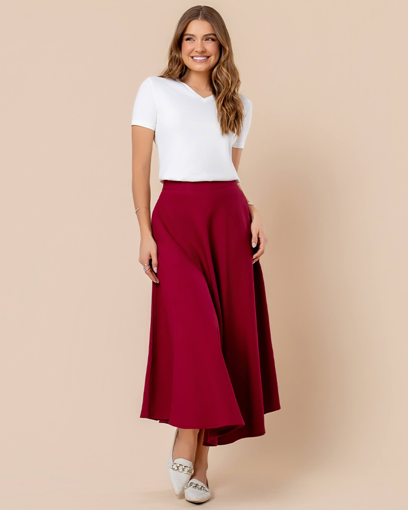 Zíper invisível na lateral, bolsos invisíveis, comprimento longuete e uma modelagem godê tradiconal, com muito movimento.