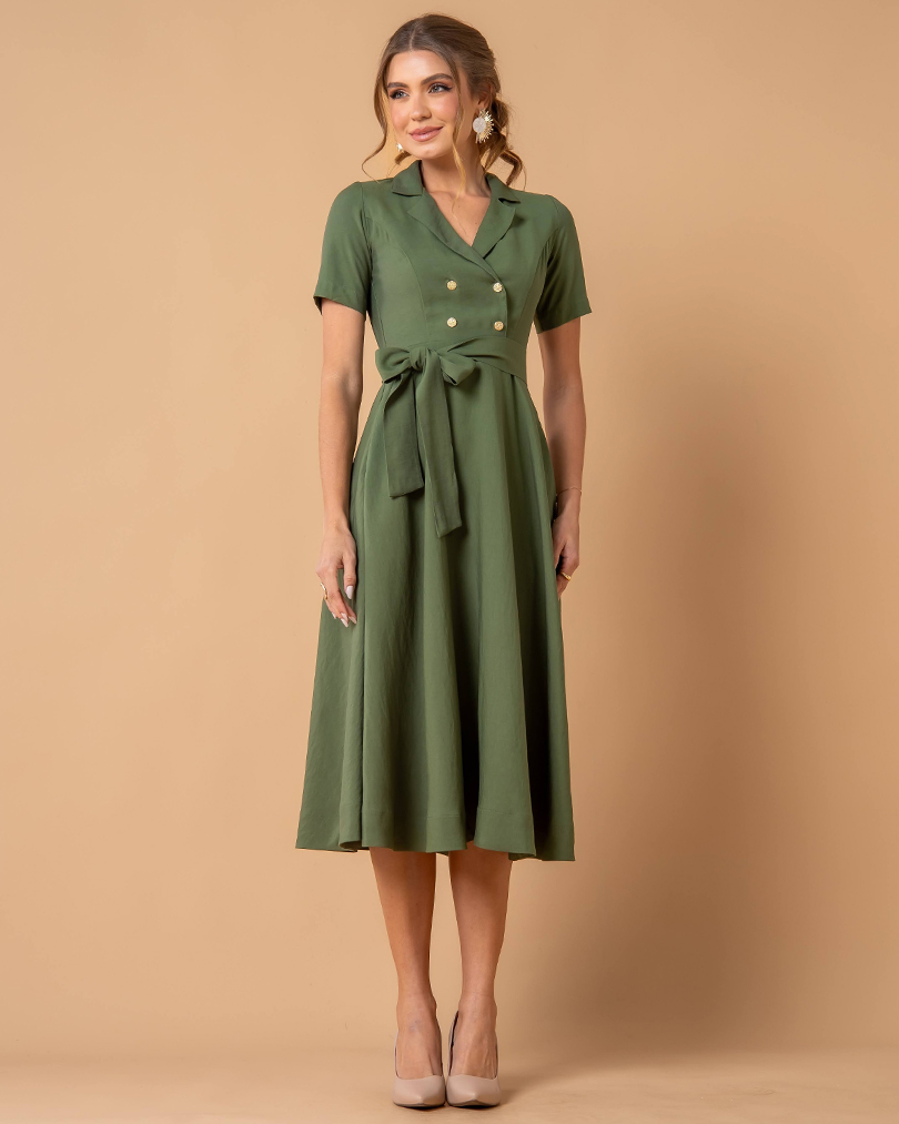 Ele conta com bolsos, botões funcionais em metal dourado, cintura marcadinha, porém soltinha, ajustável com a faixa.
